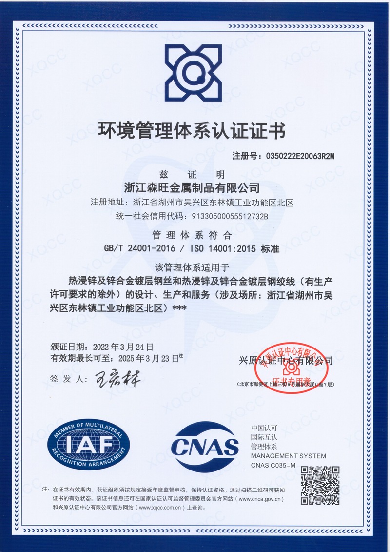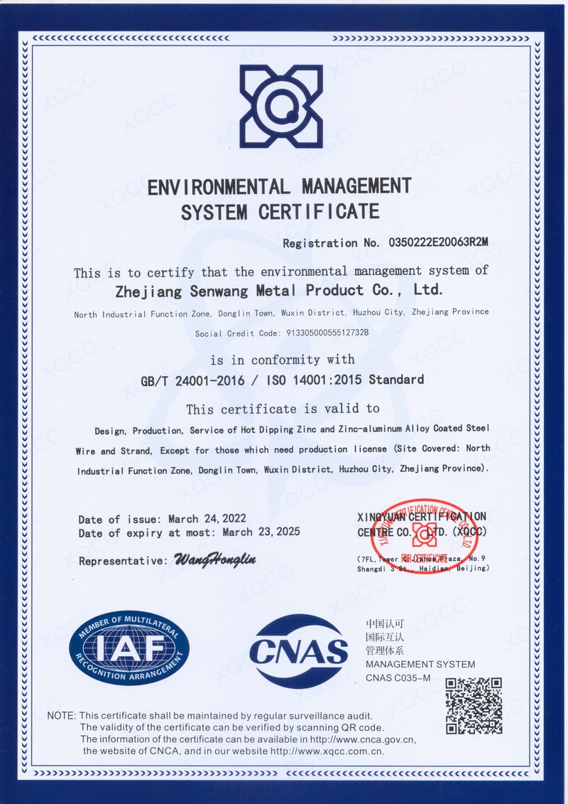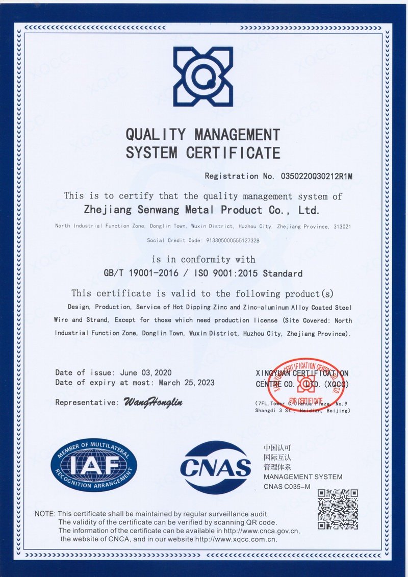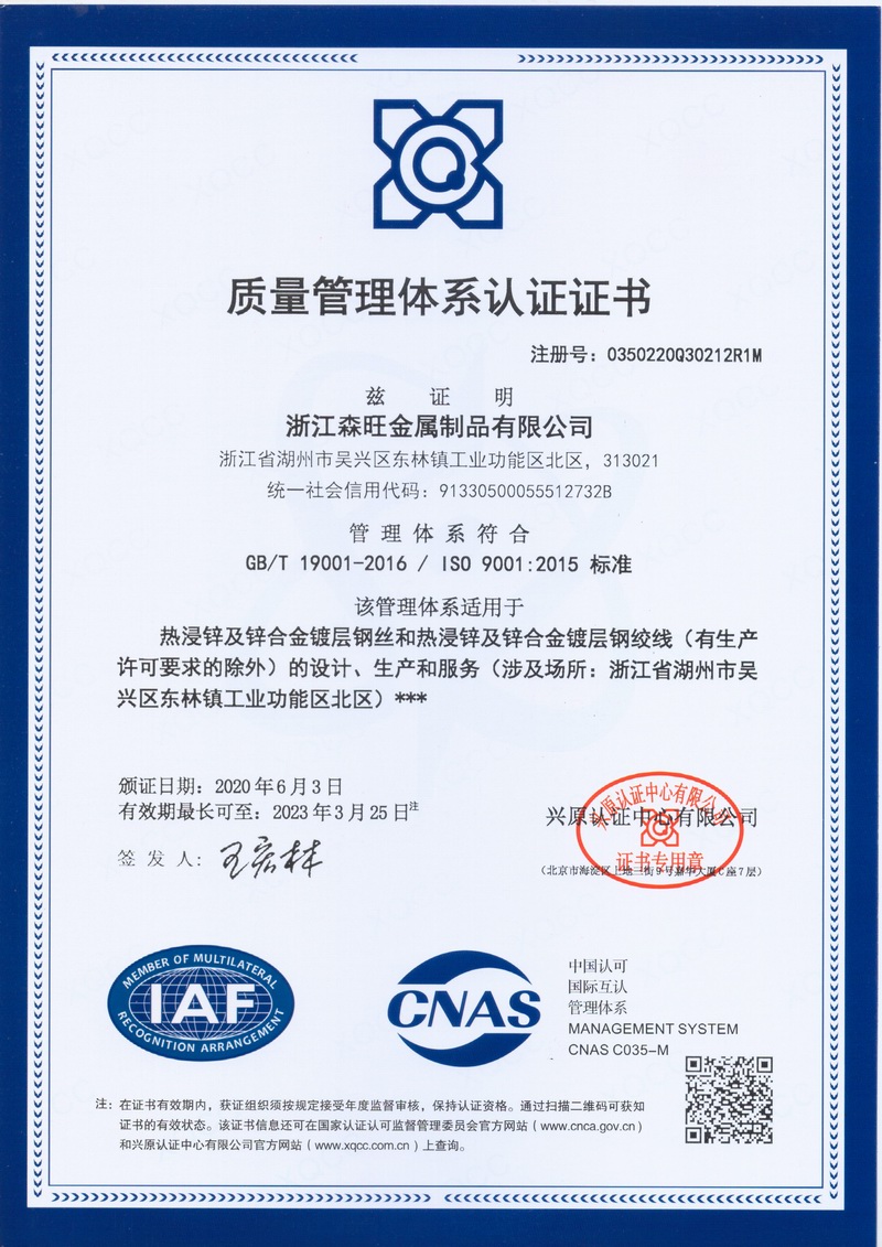 浙江森旺金屬制品有限公司成立于2012年,坐落湖州市吳興區(qū)東林鎮(zhèn)工業(yè)功能區(qū)。公司專業(yè)從事各類鍍鋅鋼絲、鋼絞線等產品的開發(fā)及生產。目前產品已廣泛應用于各類通信光電纜,電力輸送,電氣化鐵路工程,各類堤壩防護及農業(yè)溫室等工程領域。公司秉承“追求卓越品質,創(chuàng)建卓著信譽”的經(jīng)營理念,始終堅持專業(yè)化、規(guī)模化的經(jīng)營模式。